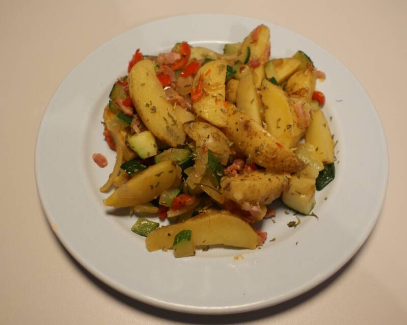 Snijd de gewassen aardappel in partjes (of je koopt een kant en klare zakje als je snel wilt zijn). Bak de spekjes in een koekenpan krokant en bruin. Schep de spekjes op een bordje. Doe wat olie in een pan en fruit de ui, knoflook even aan en schep de aardappelblokjes erdoor! bak de aardappels circa 5 minuten onder af en toe omscheppen bijna gaar. Voeg de courgette en paprika toe en bak het geheel in nog circa 5 minuten mooi bruin en beetgaar. Schep dan de spekreepjes erdoor en voeg peper, peterselie en rozemarijnnaaldjes toe.