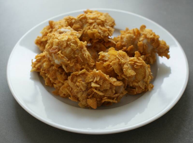 Oven voorverwarmen op 180 graden. Een bakplaat met bakpapier bedekken. Meng de bloem met kipkruiden in een kommetje. Haal de kip door de bloem en schud overtollige bloem eraf. In ei dippen en met cornflakeskruim bedekken. De kipnuggets op de bakplaat leggen en 10-15 minuten goudbruin serveren.